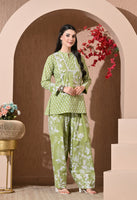 Embrace refreshing comfort with our Soft Premium Cotton Farshi salwar set. This delightful ensemble features a green and white floral printed tunic with delicate lace accents, perfectly complemented by a relaxed Farshi salwar, ideal for casual elegance.