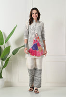 Step into a storybook of timeless elegance with our  palace Print Cotton Co-Ord Set — where fashion meets folklore. Inspired by the majestic charm of India’s regal past, this beautifully curated set features intricate monochrome architectural sketches that form a picturesque backdrop for the vibrant figure of a traditional dancer in colorful attire.